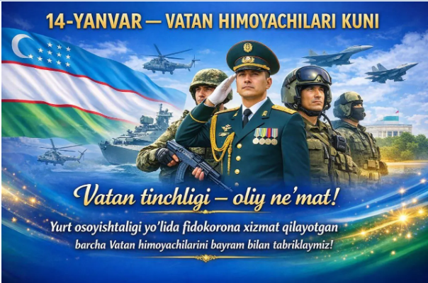 Suv xo‘jaligi vazirligi jamoasi nomidan yurtimizning mard va jasur, sadoqatli farzandlarini 14-yanvar - Vatan himoyachilari kuni munosabati bilan samimiy muborakbod etamiz!